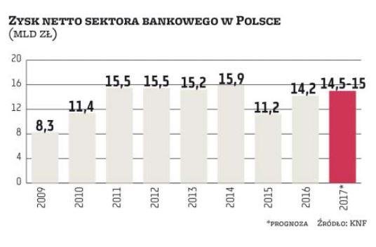 Jednak w tym roku sektor bankowy powinien zanotować nominalny wynik netto, który będzie wyższy niż w 2015 r., ostatnim przed wprowadzeniem podatku bankowego. Wtedy zysk wyniósł 11,2 mld zł netto, ale trzeba pamiętać, że obciążyły go jednorazowe koszty w wysokości 2 mld zł na ratowanie SK Banku i 600 mln zł na Fundusz Wsparcia Kredytobiorców (obie wartości brutto). Po oczyszczeniu zysk netto sektora w 2015 r. wyniósłby około 13,5 mld zł. Analitycy szacują, że w tym roku zysk może sięgnąć 14,5–15 mld zł.