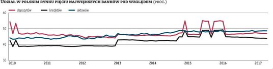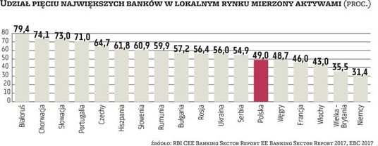 Polski sektor należy do najmniej skoncentrowanych w Europie Środkowej. Trzy największe banki reprezentują niewiele ponad jedną trzecią rynku, podczas gdy na prawie wszystkich rynkach Europy Środkowej ten współczynnik sięga powyżej 40 proc., a w niektórych krajach nawet powyżej 50 proc. (np. Czechy, Słowacja, Chorwacja). Wskaźnik koncentracji sektora bankowego w dużych krajach, takich jak Niemcy, Wielka Brytania, Włochy czy Francja, jest niższy niż w małych krajach (wynosi odpowiednio 31 proc., 36 proc., 43 proc. i 46 proc.). Jego wartość w Polsce (49 proc.) wpisuje się w ten trend, ale wszystko wskazuje na to, że koncentracja w naszym sektorze bankowym będzie jednak rosła.