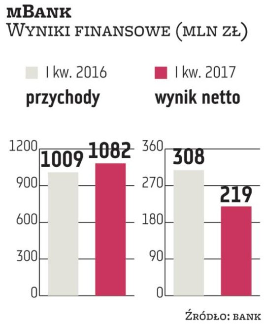 – Po pierwszym kwartale nic się nie zmieniło i 1 mld zł zysku netto w całym roku jest w zasięgu możliwości – czy będzie trochę więcej czy trochę mniej, to się okaże – mówi Cezary Stypułkowski, prezes mBanku (w 2016 r. bank miał 1,22 mld zł zysku netto, ale zasiliła go jednorazowa wpłata za Visę w wysokości 204 mln zł netto). Skonsolidowany zysk mBanku w I kwartale 2017 r. wyniósł 219 mln zł (nieco niższy od oczekiwań), czyli był o 29 proc. niższy niż rok temu i o 25 proc. niż w poprzednim kwartale. Zadecydowała o tym zmiana sposobu księgowania składek na BFG. Wyniki odsetkowy i prowizyjny wzrosły odpowiednio o 11 proc. i 18 proc. rok do roku i były podobne jak w poprzednim kwartale. W ciągu trzech miesięcy marża odsetkowa netto poprawiła się do 2,42 proc. z 2,35 proc. dzięki obniżeniu kosztów finansowania i zwiększeniu rentowności aktywów, bank widzi tu jeszcze miejsce do optymalizacji. Łączny portfel kredytów mBanku wynosi 84,5 mld zł, czyli jest taki sam jak przed kwartałem i wzrósł rok do roku o 4,5 proc. Bank nie wyklucza, że kolejne kwartały przyniosą ożywienie w kredytach korporacyjnych, które mogą wzrosnąć w banku szybciej niż obserwowany w I kwartale 6-proc. wzrost rok do roku do 34,8 mld zł.
