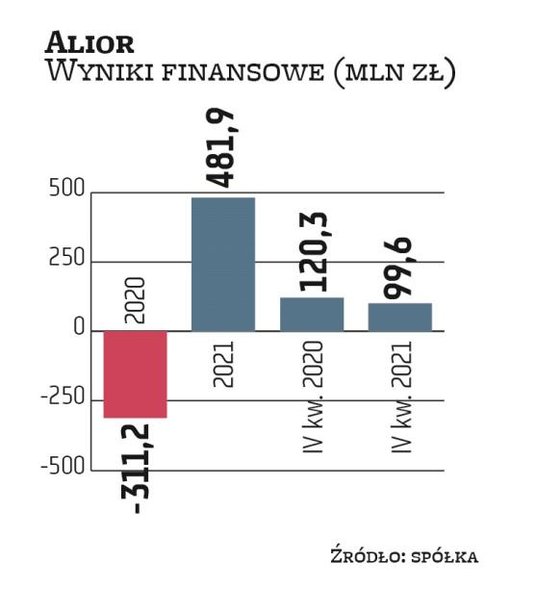 Z kolei w całym 2021 r. zysk netto Alior Banku sięgnął 481,9 mln zł, podczas gdy rok wcześniej bank miał 311,2 mln zł straty netto.
