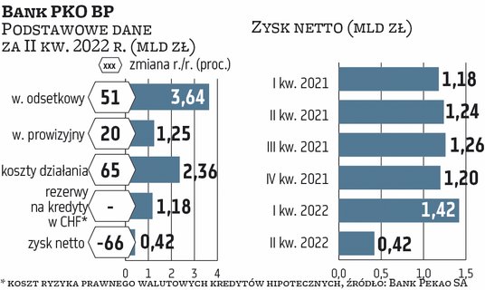 I tak, PKO BP wypracował w II kwartale wynik na działalności biznesowej na niemal 5 mld zł, co oznacza wzrost o 76 proc. rok do roku (a w całym I półroczu 9,5 mld zł, czyli o 36 proc. więcej niż w I półroczu 2021 r.). Wynik odsetkowy wniósł w II kw. 3,64 mld zł, co oznacza wzrost o 51 proc. Marża odsetkowa poprawiła się w pierwszej połowie roku do 3,19 proc., wobec 2,75 proc. rok wcześniej. Wynik z tytułu prowizji i opłat sięgnął zaś w II kwartale 1,25 mld zł, o 20 proc. więcej rok do roku, co jest bardzo wysokim wzrostem na tle sektora.