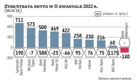 Z kolei Millennium Bank zupełnie nie załapał się na falę wznoszącą i wykazał w II kwartale stratę netto w wysokości 140 mln zł. To strata o 70 mln zł mniejsza niż rok wcześniej, ale wciąż minus.