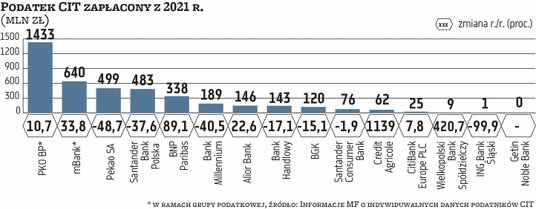 Łącznie kredytodawcy zapłacili 4,33 mld zł podatku dochodowego od osób prawnych za 2021 r. To całkiem sporo, stanowi 9,8 proc. całego CIT odprowadzonego przez duże podmioty na liście MF. Jednak w porównaniu z danymi za 2020 r. widać pewne pogorszenie. Wówczas łączny CIT od banków wyniósł 5,76 mld zł, a udział w łącznych wpływach podmiotów analizowanych przez MF wynosił aż 17,5 proc. Bezpośrednio takie spadki to efekt niższych dochodów do opodatkowania i niższej zapłaconej daniny w przypadku kilku spółek. Przykładowo ING Bank Śląski za 2020 r. zapłacił niemal 1 mld zł CIT, zaś za 2021 r. – już tylko niecały 1 mln zł (wynika z danych MF). Rok do roku mniej do budżetu odprowadziły też Pekao, Santander czy Bank Millennium.
