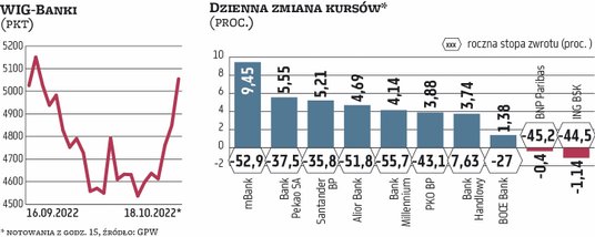 Indeks WIG-banki w ciągu dnia sięgnął maksymalnie 5 061,09 pkt wobec 4848,34 na zamknięciu w poniedziałek. Kursy Santander Bank Polska i Banku Pekao rosły o ponad 5 proc., a mBanku – nawet o ponad 9 proc.