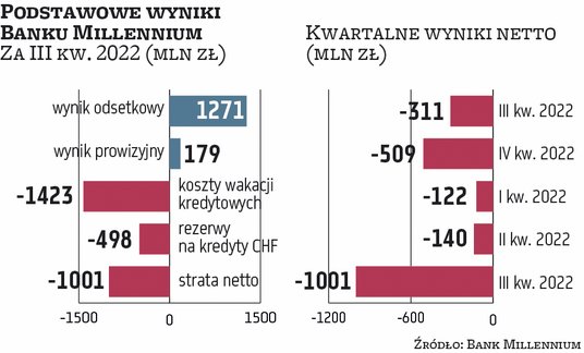 Koszty wakacji kredytowych stały się też przyczyną, że Grupa Banku Millennium przestała przejściowo spełniać minimalne wymogi Komisji Nadzoru Finansowego, jeśli chodzi o współczynniki kapitałowe. Na koniec września br. wskaźnik TCR wynosił 12,4 proc. wobec wymaganych 13,5 proc., a T1 był na poziomie 9,5 proc. wobec 10,8 proc. W efekcie bank musiał uruchomić plan naprawy, o czym wcześniej informował akcjonariuszy.