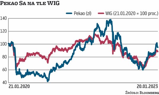 77 proc. – nawet o tyle w porównaniu z dołkiem z przełomu października i listopada rosły w styczniu notowania Pekao, po czym jednak kurs wpadł w korektę. W piątek tuż przed zamknięciem za jedną akcję płaciło się nieco powyżej 95 zł, czyli wciąż o 10 proc. więcej niż na koniec 2022 r.
