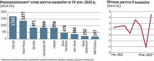 Niemal 7 mld zł może wynieść zysk dziewięciu największych banków notowanych na warszawskim parkiecie w IV kwartale 2022 r. – wynika z prognoz sześciu zespołów analitycznych, zebranych przez „Parkiet”. To dosyć imponujący wynik, zwłaszcza na tle III kwartału minionego roku, gdy banki zaraportowały 4,2 mld zł straty, a także w porównaniu z jedynie 620 mln zł zysku w IV kw. 2021 r.