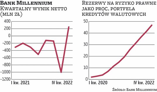 Bank Millennium notował stratę netto nieustannie od ośmiu kwartałów – w III kw. 2022 r. wyniosła ona ok. 1 mld zł, a w IV kw. 2021 r. – 509 mln. Podstawową tego przyczyną jest duże obciążenie banku kredytami we frankach szwajcarskich, co wymusiło zawiązanie sporych rezerw na ryzyko prawne, ok. 0,5 mld zł każdego kwartału, począwszy od końca 2019 r. Sytuację znacząco pogorszyły kosztowne dla banków wakacje kredytowe, które w przypadku Banku Millennium przyniosły ryzyko spadku wymogów kapitałowych poniżej wymaganych minimów i konieczność uruchomienia planu naprawczego.