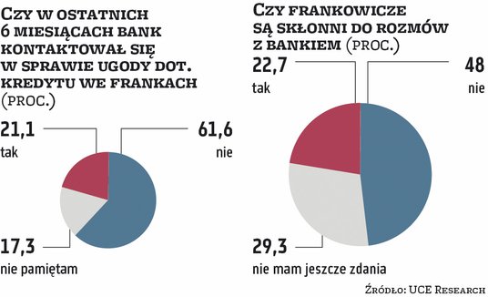 W ostatnich sześciu miesiącach tylko 12,4 proc. właścicieli kredytów hipotecznych we frankach skontaktowało się z bankiem w sprawie propozycji ugody, co oznacza spadek o 2,7 pkt proc. r/r. Z kolei 21,1 proc. wskazało, że w tym czasie to bank zwrócił się sam z taką propozycją, co oznacza wzrost o 7,3 pkt proc.