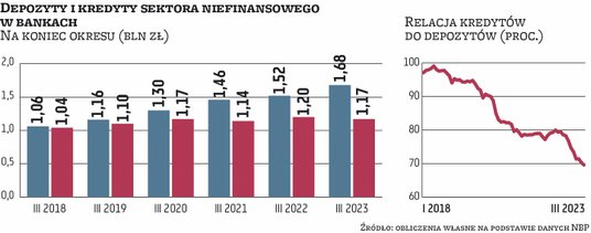 W efekcie relacja kredytów do depozytów sektora niefinansowego, co jest jedną z miar płynności banków, spadła w marcu 2023 r. do 69,6 proc. z 79,3 proc. rok wcześniej (i 70,3 proc. miesiąc wcześniej). Według wyliczeń KNF wskaźnik ten w marcu wynosił 67 proc. (i obniżył się o 0,5 pkt proc. m./m. i o 9,3 pkt proc. r./r). To jeden z najniższych poziomów po transformacji, jeszcze do 2017 r. to kredyty przeważały nad depozytami.