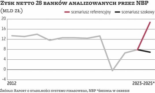 Jednocześnie NBP rysuje znacznie mniej optymistyczne perspektywy dla sektora w tzw. scenariuszu szokowym. Tu potencjalne średnie zyski spadają do 6,9 mld zł w latach 2023-2025, czyli do poziomu z ostatnich lat. Przybywa też banków, które ponoszą straty, a niektóre z nich przestają spełniać wymogi kapitałowe. I wymagają dokapitalizowania na kwotę od 3,1 mld zł do nawet 8,8 mld zł.