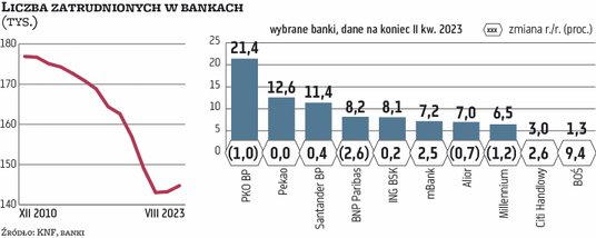 Ciekawe jednak, że zdaniem analityków nawet obecny brak zapowiedzi zwolnień grupowych nie oznacza, że sektor nie będzie musiał koniec końców wrócić do długookresowego trendu redukcji kadr. Przypomnijmy, że w ostatnich latach zatrudnienie w bankach szybko spadało. O ile jeszcze na koniec 2010 r. pracowało tam 177 tys. osób, o tyle na koniec 2021 r. już tylko 143 tys. Rok 2022 i pierwsza połowa 2023 to względna stabilizacja – nie było dużych zwolnień, a łączna liczba zatrudnionych nawet delikatnie wzrosła. Ale to raczej tylko chwilowy spokój.