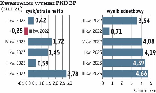 Zysk netto grupy PKO BP wyniósł w tym okresie aż 2,78 mld zł, czyli wyraźnie powyżej oczekiwań rynkowych – analitycy spodziewali się ok. 2,44 mld zł na plusie. To również najlepszy kwartalny wynik w historii banku, znacznie przebijający rekord 1,7 mld zł w IV kwartale 2022 r. A w porównaniu z II kwartałem 2023 r. jest niemal pięć razy większy.