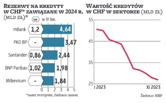 Podobnie mBank zawiązał sporo rezerw (choć nie rekordowych) w IV kwartale (1,2 mld zł), a łącznie w całym 2023 r. było to aż 4,6 mld zł. Z naszych szacunków wynika, że dzięki temu pokrycie aktywnego portfela frankowego skoczyło do ok. 95 proc. Zarówno BNP Paribas, jak i mBank znalazły się w gronie tych banków, które starają się jak najszybciej rozwiązać problem kredytów w CHF. Pokrycie portfela na poziomie około 100 proc. ma jeszcze Bank Pekao oraz ING Bank Śląski.
