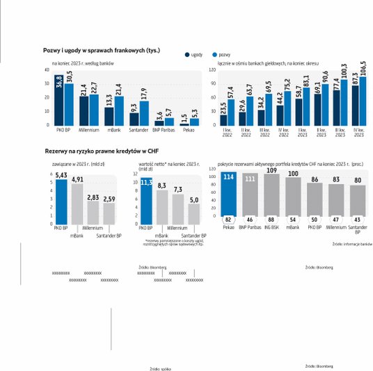 Z największą liczbą pozwów musi mierzyć się PKO BP – to największy bank w Polsce i swojego czasu udzielił najwięcej kredytów w CHF. Na koniec 2023 r. było to już nieco ponad 30 tys. pozwów, czyli o niemal 11 tys., więcej niż na koniec 2022 r.