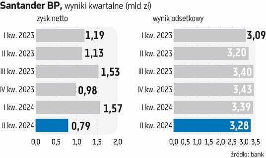 Grupa Santander BP w II kwartale bieżącego roku zanotowała ok. 795 mln zł zysku netto. To sporo więcej od oczekiwanych przez analityków średnio 692 mln zł, ale jak na ten bank to relatywnie mało – o 49 proc. mniej niż kwartał wcześniej i o 30 proc. mniej niż rok temu.