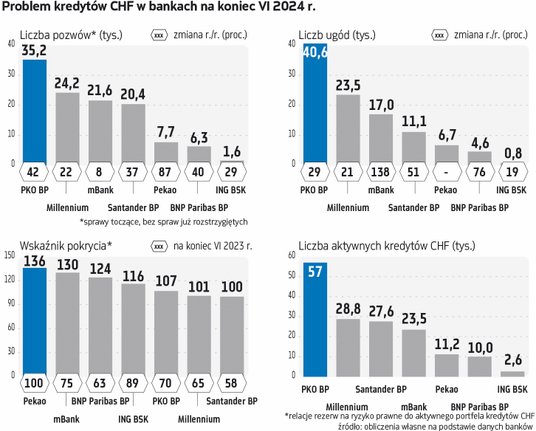 Od momentu słynnego wyroku TSUE z czerwca 2023 r. frankowicze złożyli ok. 38 tys. nowych pozwów przeciwko bankom – wynika z analizy „Parkietu” danych podawanych przez siedem banków notowanych na warszawskiej giełdzie. Rok wcześniej (w okresie II kw. 2022 r. – II kw. 2023 r.) było ok. 29,8 tys. Wyraźnie widać więc, że wizja darmowego kredytu podziałała na wyobraźnię posiadaczy kredytów CHF i przyspieszyła ich decyzje o wejściu na ścieżkę sądową.