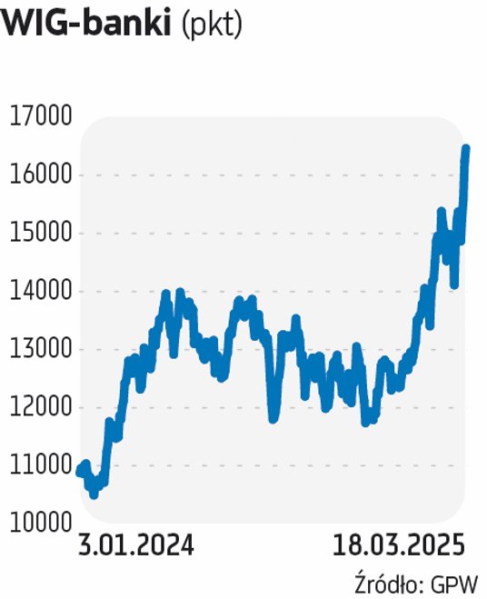 Chodzi m.in. o PKO BP, którego kurs przekroczył 80 zł, a jego kapitalizacja przebiła „magiczne” 100 mld zł. Swoje rekordy, które padły ledwie w poniedziałek, poprawił też Alior Bank (z maksymalnym kursem w ciągu dnia na poziomie 113,9 zł i kapitalizacją sięgającą niemal 14,5 mld zł) oraz mBank (z najwyższym kursem na poziomie 842,8 zł i kapitalizacją ponad 35 mld zł). Z kolei akcje BNP Paribas BP zrównały się na chwilę z dotychczas najwyższym poziomem (sięgnęły 114 zł).