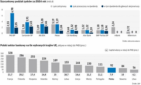 Według naszych szacunków z zysku za 2024 r. ten podział będzie wynosił mniej więcej 40 proc. do 60 proc. To znaczy, że ok. 13,7 mld zł zasili bankowe kapitały, a ok. 21,1 mld zł popłynie do akcjonariuszy.