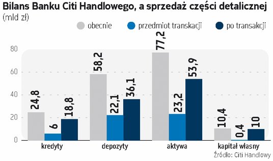 Dla Citi Handlowego pozbycie się części detalicznej oznacza, przynajmniej w pierwszej fazie, skurczenie się biznesu. I tak, wartość aktywów spadnie o ok. 30 proc., do 54 mld zł, kredytów – o 24 proc., do 18,8 mld zł, a depozytów – o 38 proc., do 36,1 mld zł. Liczba pracowników spaść ma o ponad połowę, do ok. 1,2 tys. osób. Władze banku podkreślały, że sprzedaż części detalicznej wcale nie oznacza ograniczenia działalności w Polsce. Przeciwnie, Citi Handlowy widzi potencjał dalszego dynamicznego rozwoju, tyle że w segmencie bankowości instytucjonalnej, która obecnie odpowiada za ponad 70 proc. przychodów.