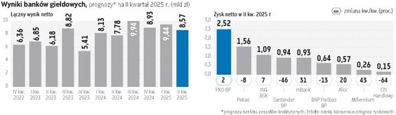 W okresie kwiecień–czerwiec dziewięć największych banków notowanych na giełdzie zarobiło niemal 8,7 mld zł – wynika z analizy "Parkietu" przygotowanej na podstawie prognoz sześciu zespołów analitycznych. Taki wynik netto jest o niemal 11 proc. wyższy niż rok wcześniej, choć jednocześnie o ok. 8 proc. niższy niż kwartał wcześniej.