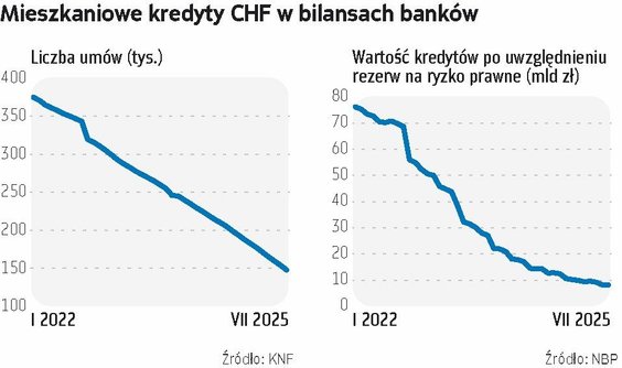 Jednocześnie bardzo szybko spada wartość kredytów CHF w bilansach banków. Na koniec lipca 2025 r. wynosiła ona 8,2 mld zł. To wciąż spora kwota, ale dla porównania podajmy, że rok temu było to 14,2 mld zł, zaś w połowie 2016 r. – ok. 140 mld zł. Ten dynamiczny spadek wynika z naturalnego procesu spłacania hipotek wraz z upływem czasu, przede wszystkim zaś z postępów tzw. sagi frankowej.