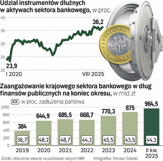 NBP wyjaśnia, że przyczyną tej zmiany był m.in. rosnący udział obligacji skarbowych i gwarantowanych przez Skarb Państwa w aktywach banków. Ile dokładnie on wynosi, trudno oszacować, ale wiadomo, że ogółem instrumenty dłużne w aktywach sektora w połowie tego roku wynosiły aż 35 proc., podczas gdy na początku 2020 r. było to ok. 24 proc.