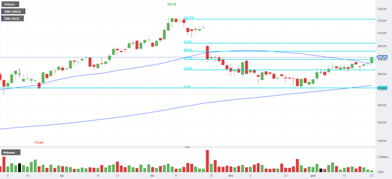 Środowe wybicie pozwala założyć, że dotarcie do około 201 zł to minimum, którego można oczekiwać po kupujących. Zwłaszcza że cały dotychczasowy ruch wzrostowy, zapoczątkowany pod koniec września, wystartował przy wyraźnym wzroście obrotów i na silnym wsparciu. Wrześniowy dołek ukształtował się w okolicach 171 zł. Poziom ten pokrywa się z 50-proc. zniesieniem fali wzrostowej od dołka z kwietnia tego roku. Gdyby jednak środowe wybicie okazało się pułapką zastawioną przez popyt, a Pekao szybko wróciłoby poniżej 189 zł, można spodziewać się wtedy testu wrześniowych dołków.