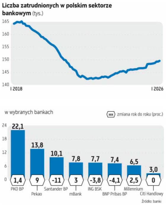 Nie wszystkie banki unikają jednak redukcji zatrudnienia. ING BSK realizuje plan restrukturyzacji ogłoszony w 2023 r., w ramach którego zaplanowano redukcję około 1450 etatów w latach 2024–2026. Bank podkreśla, że proces ten opiera się m.in. na odejściach dobrowolnych, programach wcześniejszych emerytur oraz ograniczaniu nowych rekrutacji. Na koniec 2025 r. zatrudnienie wynosiło ok. 7,7 tys. osób, czyli o 683 mniej niż dwa lata wcześniej.