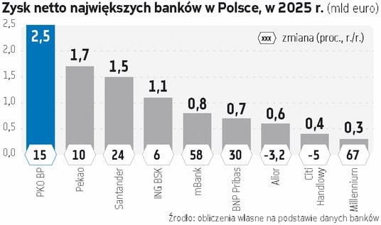 Warto w tym miejscu zauważyć też wyniki austriackiej Erste Group, która co prawda plasuje się poza ścisłą czołówką największych banków w Europie, ale w Polsce stała się istotnym graczem, przejmując Santander Bank Polska. Erste zakończyła 2025 r. z rekordowym zyskiem netto na poziomie 3,51 mld euro, co oznacza wzrost o 12,3 proc. rok do roku.