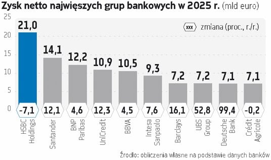 Wśród największych instytucji, niezmiennie od wielu lat, pierwsze miejsce zajmuje brytyjski HSBC Holdings. Choć zanotował on spadek zysku o ok. 7 proc. rok do roku, to i tak jego wynik netto w wysokości 21 mld euro wciąż stawia go w innej lidze. To niemal tyle, ile zarobiły trzy kolejne banki w stawce razem wzięte, i niemal dwa razy więcej niż zysk całego polskiego sektora, który wyniósł w 2025 r. ok. 11,2 mld euro (48 mld zł).