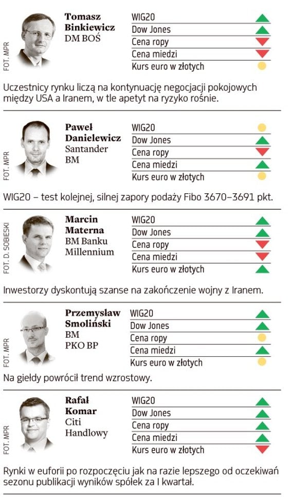 Prognozy znanych maklerów i analityków dla indeksów największych spółek w Warszawie i Nowym Jorku, cen ropy i miedzi oraz notowań pary euro/złoty.