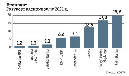 Inna sprawa, że rok 2021 r. w danych KDPW mógł być jeszcze lepszy, gdyby nie fakt, że część brokerów w ciągu roku zdecydowała się na zamknięcie nieaktywnych kont. Tak uczyniło chociażby BM mBanku. Nie przeszkodziło to jednak firmie w zajęciu pierwszego miejsca w statystykach. Oficjalnie w ciągu roku przybyło jej prawie 20 tys. kont. Faktyczny wzrost był natomiast dużo większy.