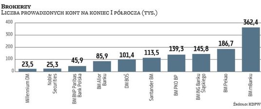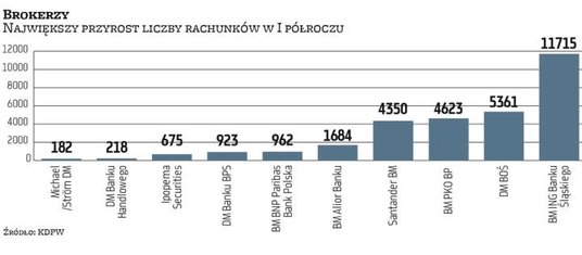 Chociaż może oficjalne statystyki nie oddają tego aż tak dobrze, to w I półroczu brokerzy znowu nie mogli narzekać na brak zainteresowania rynkiem wśród nowych klientów. Z danych KDPW wynika, że w okresie od stycznia do czerwca w skali całego rynku przybyło 11 tys. kont. Statystyki są jednak „skażone" zamykaniem nieaktywnych kont przez niektóre instytucje. Gdyby pominąć ten fakt, to okazuje się, że większość pośredników zaliczyła jednak wyraźny wzrost liczby prowadzonych rachunków. A jak wiadomo, apetyt rośnie w miarę jedzenia.