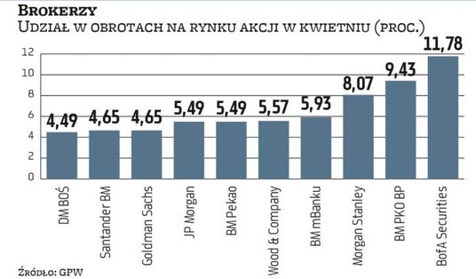 Dużo ciekawsze rzeczy dzieją się za plecami wspomnianej trójki. Ożywiły się niektóre z polskich firm. BM mBanku zajęło w kwietniu czwarte miejsce w zestawieniu. BM Pekao znalazło się na siódmej pozycji, Santander BM – na ósmej, zaś czołową dziesiątkę zamyka DM BOŚ. W niej znajdziemy jeszcze takie firmy, jak Wood & Company, JP Morgan oraz Goldman Sachs.