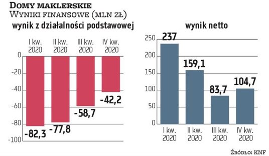 Z danych publikowanych cyklicznie przez Komisję Nadzoru Finansowego wynika, że całkowity zysk netto branży wyniósł w ubiegłym roku 584,5 mln zł wobec niecałych 28 mln zł w 2019 r. Poprawa ta to przede wszystkim efekt zysku z operacji instrumentami przeznaczonymi do obrotu. Z danych nadzoru wynika natomiast, że obsługa klientów i pośrednictwo w handlu to wciąż biznes, który daje straty, przynajmniej teoretycznie. Ta w 2020 r. wyniosła prawie 261 mln zł. W 2019 r. strata z działalności podstawowej wyniosła prawie 265 mln zł. Kontrastuje to jednak z informacjami płynącymi od samych brokerów, dla których ubiegły rok był wyjątkowo udany.