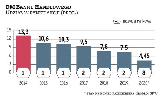 Inna sprawa, że model funkcjonowania DM Banku Handlowego nieco różni się od wspomnianych wcześniej podmiotów. Broker ten żyje przede wszystkim z obsługi klientów zagranicznych oraz instytucjonalnych. Przez wiele lat był niekwestionowanym liderem rynku, jednak w ostatnich miesiącach jego pozycja wyraźnie osłabła.