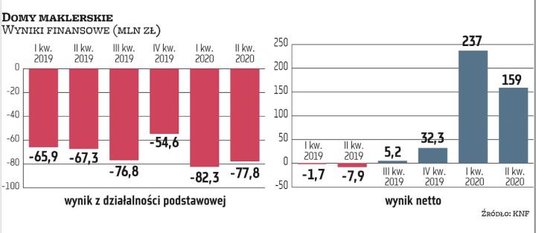 Jest jednak i druga strona medalu, którą można zauważyć w wynikach opublikowanych przez KNF. Branża wciąż notuje stratę na działalności podstawowej – czyli m.in. obsłudze zleceń kupna i sprzedaży papierów wartościowych, zarządzaniu portfelami czy doradztwie inwestycyjnym. Strata ta w II kwartale wyniosła niecałe 78 mln zł, a w całym I półroczu 160,1 mln zł.