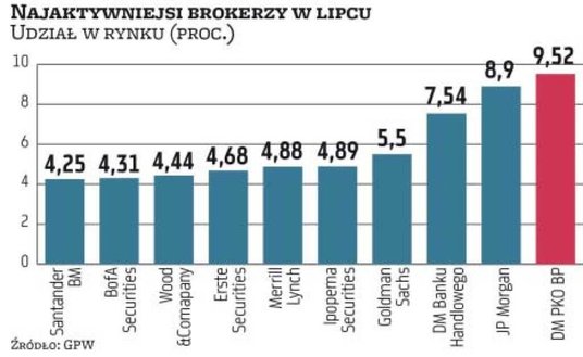Na razie nie sprawdzają się więc niektóre przewidywania sugerujące, że zawirowania kadrowe w DM PKO BP mogą się odbić na pozycji rynkowej tej firmy. Przypomnijmy, że na początku czerwca gruchnęła wiadomość, że z instytucją rozstaje się jej dyrektor Filip Paszke. Jego miejsce co prawda ma zająć inny ze znanych maklerów, Grzegorz Zawada, ale stanie się to dopiero z początkiem września. Jak jednak pokazał miniony miesiąc, stan przejściowy wcale nie szkodzi DM PKO BP.
