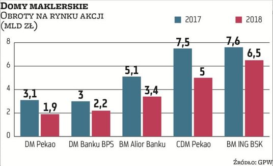 Obroty zrealizowane przez DM Pekao w II półroczu były o prawie 18 proc. niższe niż w I półroczu. DM Banku BPS zaliczyły prawie 15-proc. spadek. O 5 proc. spadły również obroty w CDM Pekao, a w BM Alior Banku o 2 proc. Na tym tle wyróżnia się BM ING Banku Śląskiego, które praktycznie powtórzyło wynik z I półrocza. Nie zmienia to jednak faktu, że w ujęciu łącznym wskazane podmioty zmniejszyły wartość zrealizowanych transakcji o ponad 5 proc. Kontrastuje to ze statystykami dotyczącymi całego rynku, gdzie wartość obrotów w II półroczu była nawet nieznacznie wyższa niż w pierwszej połowie roku.