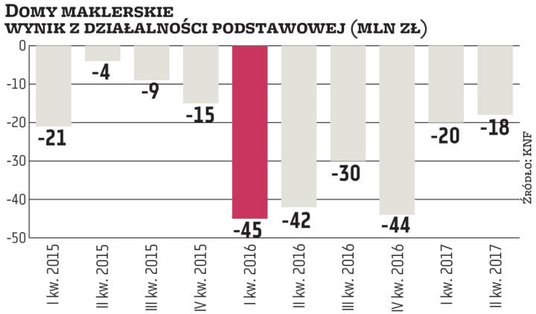 Jeszcze rok temu o tej porze nastroje w branży maklerskiej były, delikatnie rzecz ujmując, nie najlepsze. Sytuacja zmieniła się jednak o 180 stopni. Brokerzy ostatnie miesiące opisują jako jeden z najlepszych okresów od lat. Wszystko to oczywiście za sprawą większej aktywności inwestorów na warszawskiej giełdzie. Do ideału wciąż jednak jest daleko. Mimo bowiem że koniunktura wyraźnie się poprawiła, to jak wynika z danych KNF, rezultat na działalności podstawowej brokerów wciąż pozostawia wiele do życzenia.