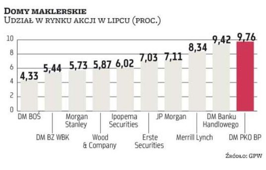 DM Banku Handlowego, DM PKO BP oraz Merrill Lynch – to właśnie te trzy instytucje toczą w tym roku bój o palmę pierwszeństwa na rynku wtórnym akcji. Lipiec padł łupem DM PKO BP.