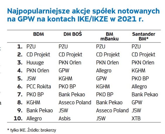 Statystyki, jakie przekazali nam brokerzy, wskazują jednoznacznie, że inwestorzy, kiedy myślą o emeryturze wybierają przede wszystkim największe spółki, wchodzące w skład indeksu WIG20. Na drugim miejscu zestawienia, niezależnie od instytucji, znalazła się firma CD Projekt. Jej wysoka pozycja w rankingach maklerskich może być sporym zaskoczeniem. CD Projekt w ubiegłym roku przeżywał bowiem ciężkie chwile, co było związane m.in. z rozczarowującym debiutem gry „Cyberpunk 2077". Od tamtej pory akcje tej spółki nie zaliczyły wyraźnego odbicia.