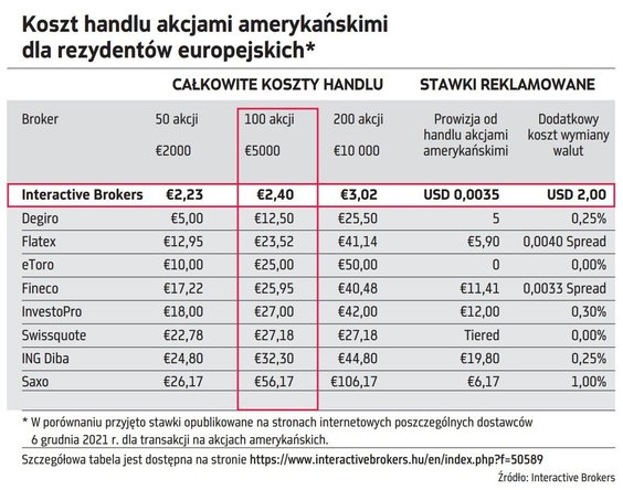 Interactive Brokers przygotował zestawienie dla przykładowych transakcji potencjalnego inwestora z Europy, który ma rachunek prowadzony w euro i chciałby zainwestować w akcje amerykańskie. W jednej z nich klient chce kupić 50 akcji za 2 tys. euro, w kolejnej 100 akcji za 5 tys. euro, a w ostatniej 200 akcji za 10 tys. euro. Broker policzył, ile takie transakcje kosztowałyby u jego konkurencji działającej w Europie (część firm kieruje ofertę też do polskich inwestorów), biorąc pod uwagę stawki prowizji i innych opłat na dzień 6 grudnia 2021 r. Okazało się, że u najtańszego z jego konkurentów – i zarazem jednego z brokerów, którzy chwalą się w reklamach handlem bez prowizji – pierwsza z transakcji (50 akcji) kosztowałaby 5 euro, kolejna (100 akcji) – 12,50 euro, a ostatnia (200 akcji za 10 tys. euro) – 25,50 euro. W przypadku najdroższego z brokerów suma opłat za pierwszą z transakcji sięgnęłaby 26,17 euro, co odpowiada ponad 1,3 proc. zainwestowanej kwoty!