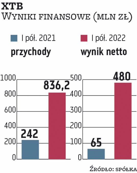 Te przebiły bowiem wyraźnie prognozy Trigon DM (jedyna firma, która oficjalnie zajmuje się analizą XTB). Analitycy spodziewali się, że XTB zarobi w II kwartale około 155 mln zł. Tymczasem firma miała 227,3 mln zł zysku netto. Po raz kolejny zrealizowała także cel, jeśli chodzi o liczbę pozyskanych klientów. Zarząd zakładał, że kwartalnie będzie przybywało co najmniej 40 tys. kont. W II kwartale przybyło ich 45,7 tys., a w całym I półroczu 101 tys.