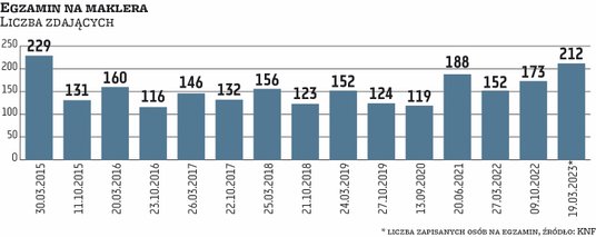 Już w niedzielę kolejny egzamin na maklera papierów wartościowych. Chętnych do tego, by zdobyć licencję, znów nie brakuje. Jak wynika z informacji przekazanej przez Komisję Nadzoru Finansowego, na egzamin zgłosiło się 212 osób. Dla jednych szklanka jest do połowy pełna, dla innych do połowy pusta. Aby znaleźć wynik lepszy od tego, który obecnie obserwujemy, trzeba cofnąć się do marca 2015 r. Wtedy do egzaminu przystąpiło 229 osób. Pesymiści zauważą jednak, że ponad dziesięć lat temu na egzamin regularnie zgłaszało się około 300 chętnych, a w marcu 2010 r. było ich prawie 500. Na powtórkę tamtych osiągnięć się nie zanosi, bo i rynek maklerów mocno się zmienił na przestrzeni lat.