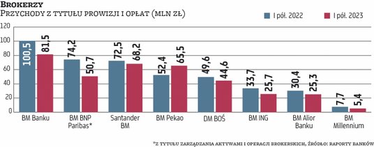 O blisko 30 proc. spadły przychody prowizyjne w BM Millennium i wyniosły one 5,4 mln zł. Blisko 24-proc. spadek do 25,7 mln zł zaliczyło także BM ING Banku Śląskiego. O blisko 19 proc. przychody spadły w BM mBanku. W I półroczu wpływy biura z tytułu prowizji maklerskich i za organizację emisji wyniosły 81,5 mln zł. O niemal 17 proc., do 25,3 mln zł, spadły z kolei przychody prowizyjne w BM Alior Banku.