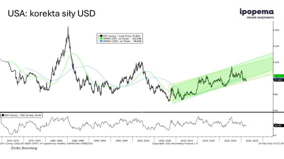 Przez ostatnie 50 lat były do tej pory dwa zakończone cykle siły i słabości dolara. Teraz mamy trzeci cykl, który opiera się o dolne ograniczenie trendu wzrostowego. Przestrzeń do dalszego osłabienia się dolara jest. Są przesłanki do rotacji kapitału, zmiany polityki Stanów Zjednoczonych czy też ich postrzegania. Inwestorzy zmieniają swoje nastawienie do dolara. Nadal nie ma argumentów ku temu, żeby dolar się wyraźnie umacniał. Pytanie, czy pójdzie bokiem, czy będzie się dalej osłabiał. Większe szanse są na kontynuację słabości dolara.