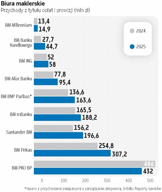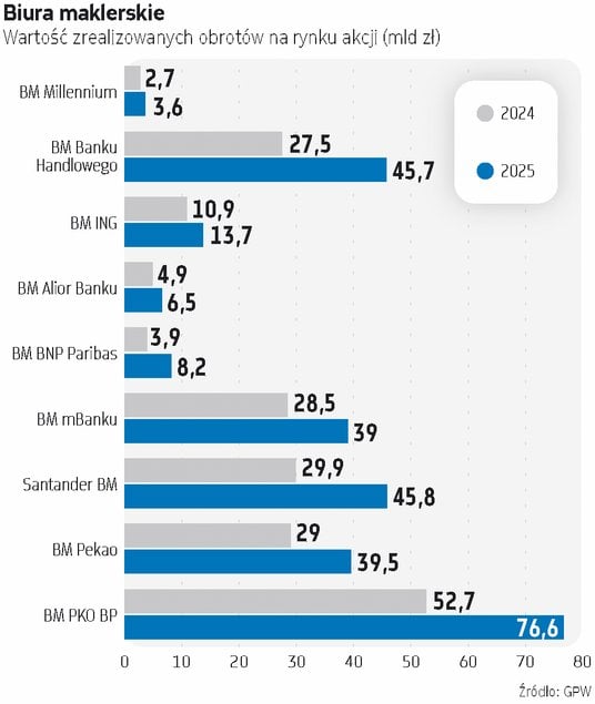 Rok 2025 potwierdził, że branża maklerska mocno uzależniona jest od koniunktury rynkowej. Kiedy indeksy rosną, a co jeszcze ważniejsze, idzie to w parze z rosnącą aktywnością inwestorów, jest to woda na młyn dla branży maklerskiej. Liczby zresztą mówią same za siebie. W 2025 r. obroty na głównym rynku akcji wzrosły o blisko 42 proc. i osiągnęły rekordowy poziom 470,3 mld zł, dzięki czemu niemal wszystkie biura maklerskie zanotowały wzrost przychodów z tytułu opłat i prowizji, który wyniósł od kilkunastu do nawet kilkudziesięciu procent licząc rok do roku.