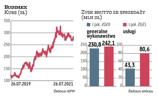 O maksymalnie 4,6 proc., do 283,5 zł, rosły w poniedziałek – na spadkowym rynku – notowania Budimeksu po publikacji wyników za I połowę 2021 r. oraz deklaracji sowitej dywidendy zaliczkowej. Planowana na II półrocze wypłata ma wynieść do 381 mln zł (14,9 zł na akcję), czyli połowę jednostkowego zysku zaksięgowanego w I połowie br., na który wpływ miała sprzedaż spółki deweloperskiej. Przy kursie z piątkowego zamknięcia dawało to stopę dywidendy 5,4 proc. W czerwcu akcjonariusze otrzymali w ramach podziału ubiegłorocznego zysku 16,7 zł na walor.